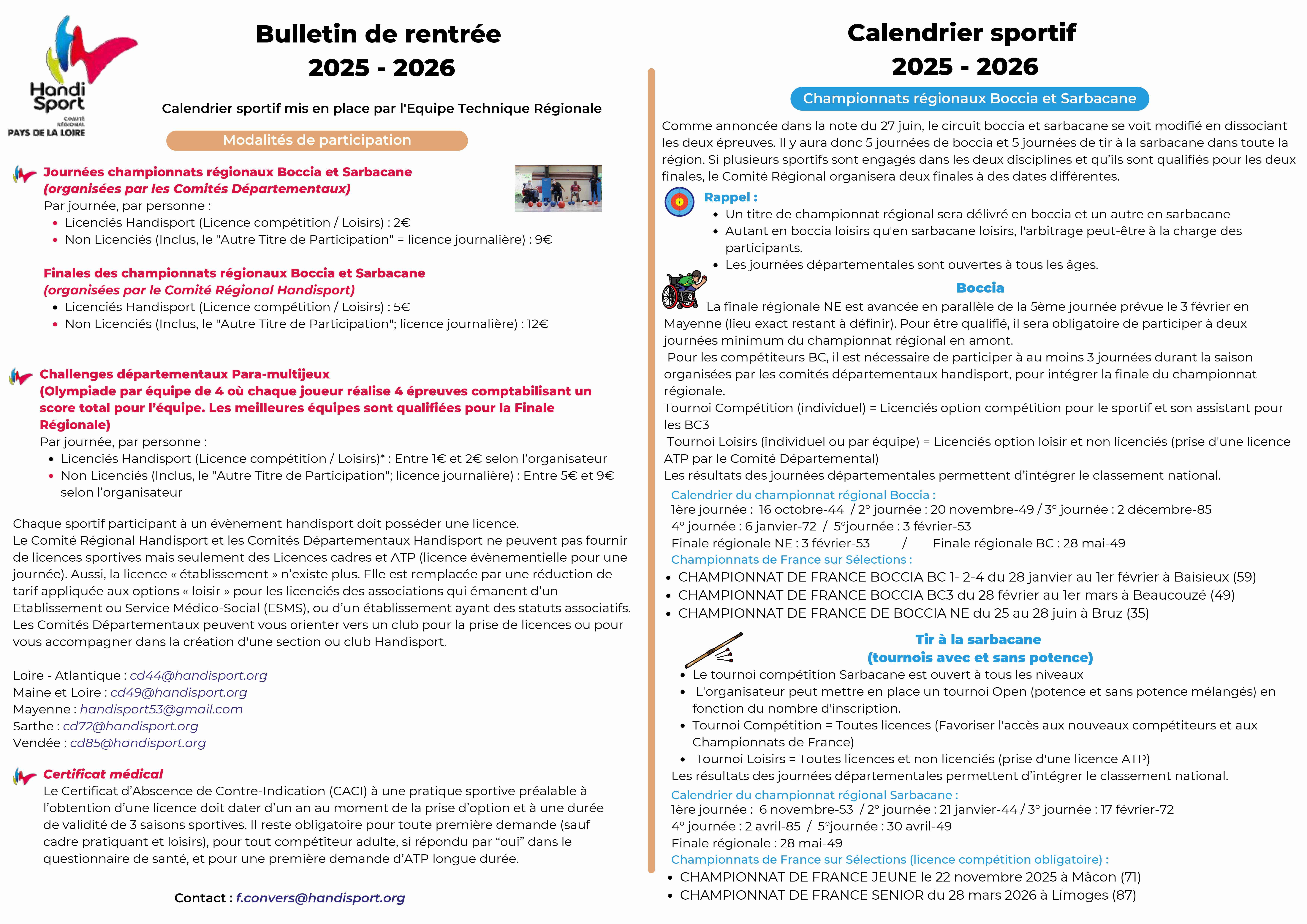 Le Comité Handisport de la Sarthe coorganise avec le Comité handisport du Maine et Loire le CHAMPIONNAT DE FRANCE DE BOCCIA, classification BC3 le 28 février et 01 mars 2026, au complexe sportif SPORTCO de Beaucouzé (49).
